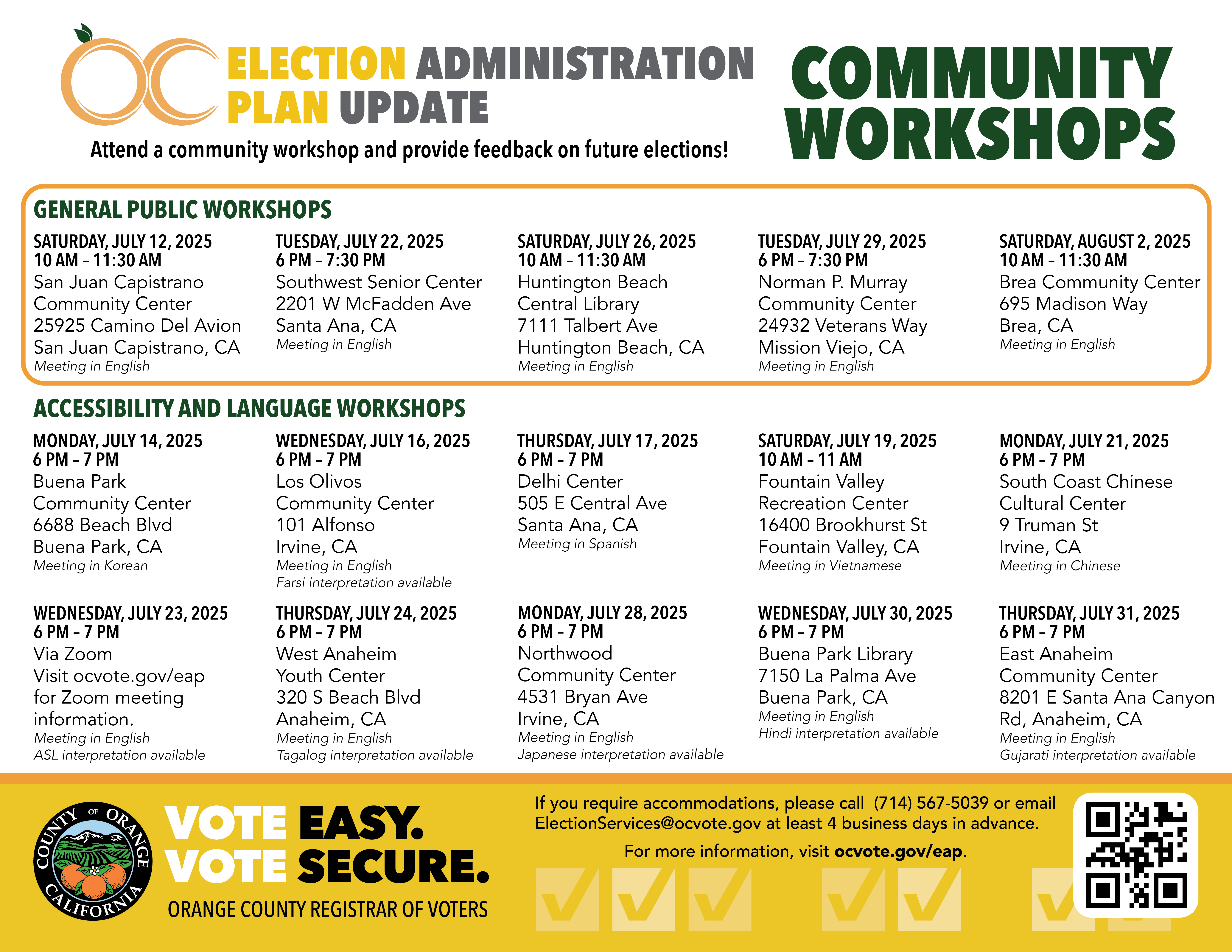 Between July 12, 2025 through August 2, 2025, the Registrar of Voters conducted a total of 15 community workshops and 30 small group community meetings throughout the county, all designed to help shape the future of voting in Orange County. The workshops provided an overview of the EAP update process and serve as an opportunity to gather community feedback.