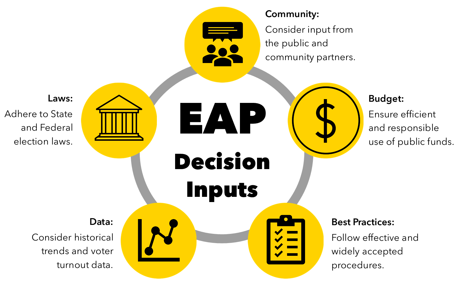 Your input is important and what we heard from you and the community was used to prepare an Election Administration Plan for the County. In addition to public feedback, there are other items considered when updating the plan.