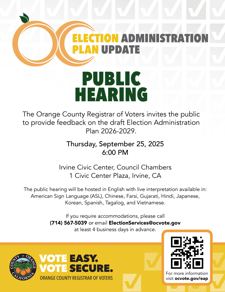 The public hearing is a requirement of the Voter’s Choice Act. During the meeting, the Registrar of Voters’ Office will provide an update on the Election Administration Plan. The meeting is scheduled for September 25, 2025 at Irvine City Hall at 6 p.m. Interpretation will be provided in the following languages: American Sign Language (ASL), Chinese, Korean, Spanish and Vietnamese.