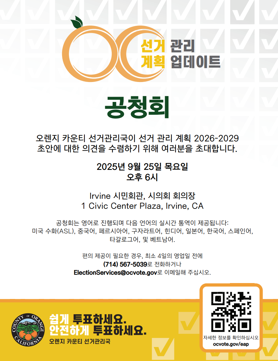 공청회는 유권자 선택법의 요건입니다. 회의 동안, 선거관리국 사무실은 선거 관리 계획의 업데이트를 제공합니다. 회의는 Irvine 시청에서 2025년 9월 25일 오후 6시에 예정되어 있습니다. 다음 언어로 통역이 제공됩니다: 미국 수화(ASL), 중국어, 한국어, 스페인어, 베트남어.