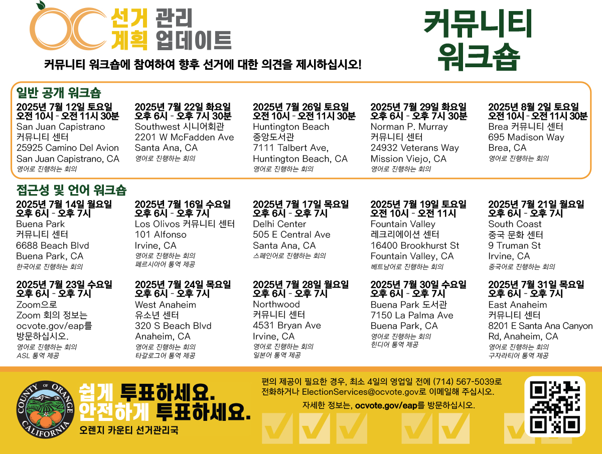 2025년 7월 12일에서 2025년 8월 2일 사이에 선거관리국은 카운티 전역에서 총 15회의 커뮤니티 워크숍과 30회의 소규모 그룹 회의를 개최했으며, 이는 모두 오렌지 카운티 내 투표의 미래를 결정짓는 데 도움이 되도록 설계되었습니다. 워크숍은 EAP 업데이트 과정의 개요를 제공하고 커뮤니티 의견을 수렴하는 기회로 작용했습니다.