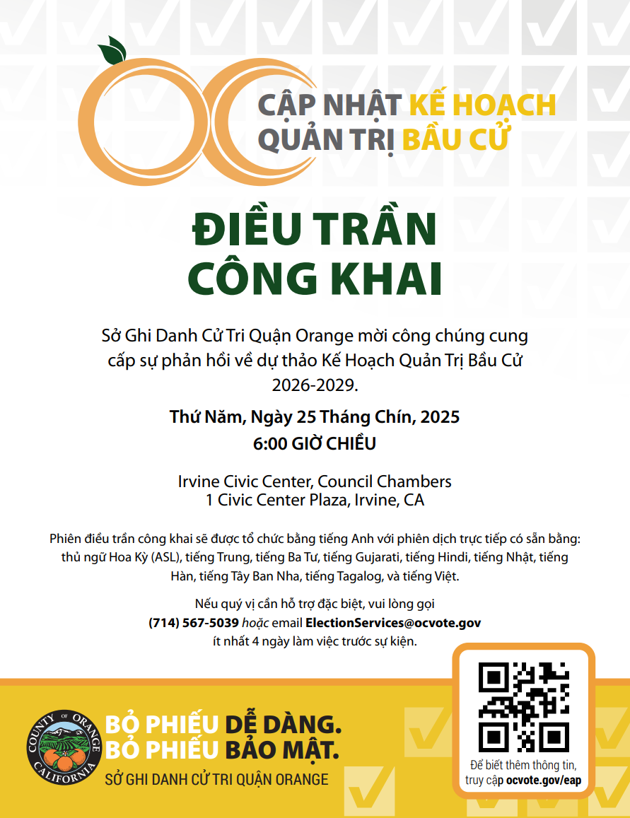 Sở Ghi Danh Cử Tri Quận Orange đã tố chức một buổi điều trần công khai về Cập nhật Kế Hoạch Quản Trị Bầu Cử vào Ngày 25 Tháng 9 Năm 2025.